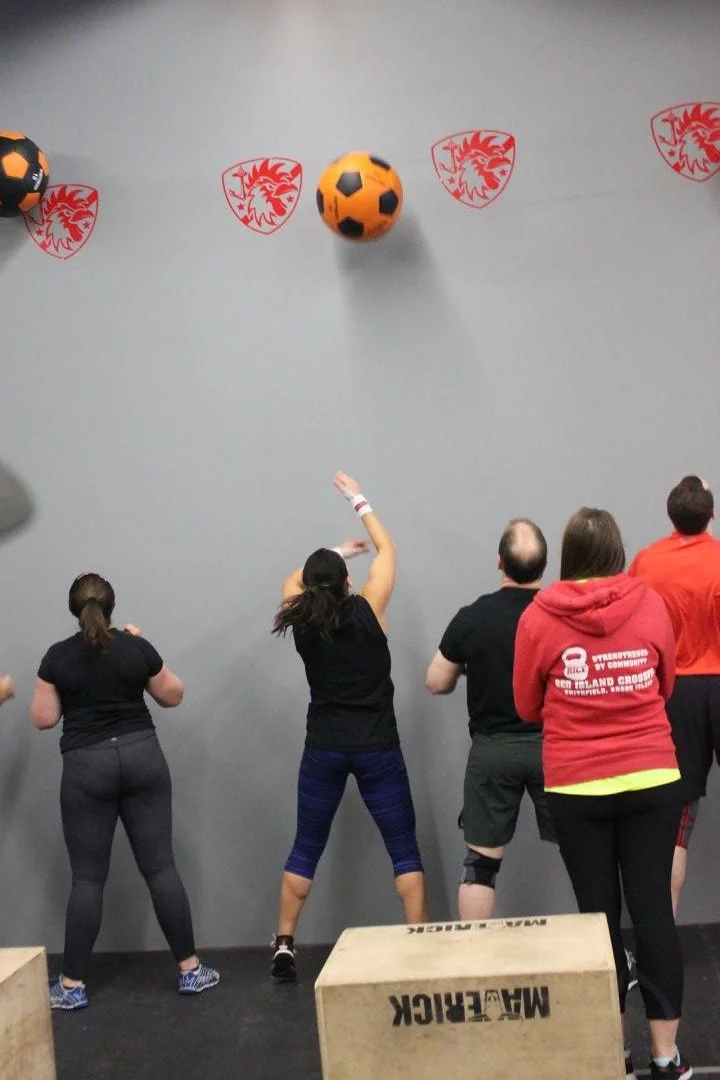 55 wall-ball shots, (14-lb. ball to 9-ft. target for Women/20-lb. ball to 10-ft. target for Men)