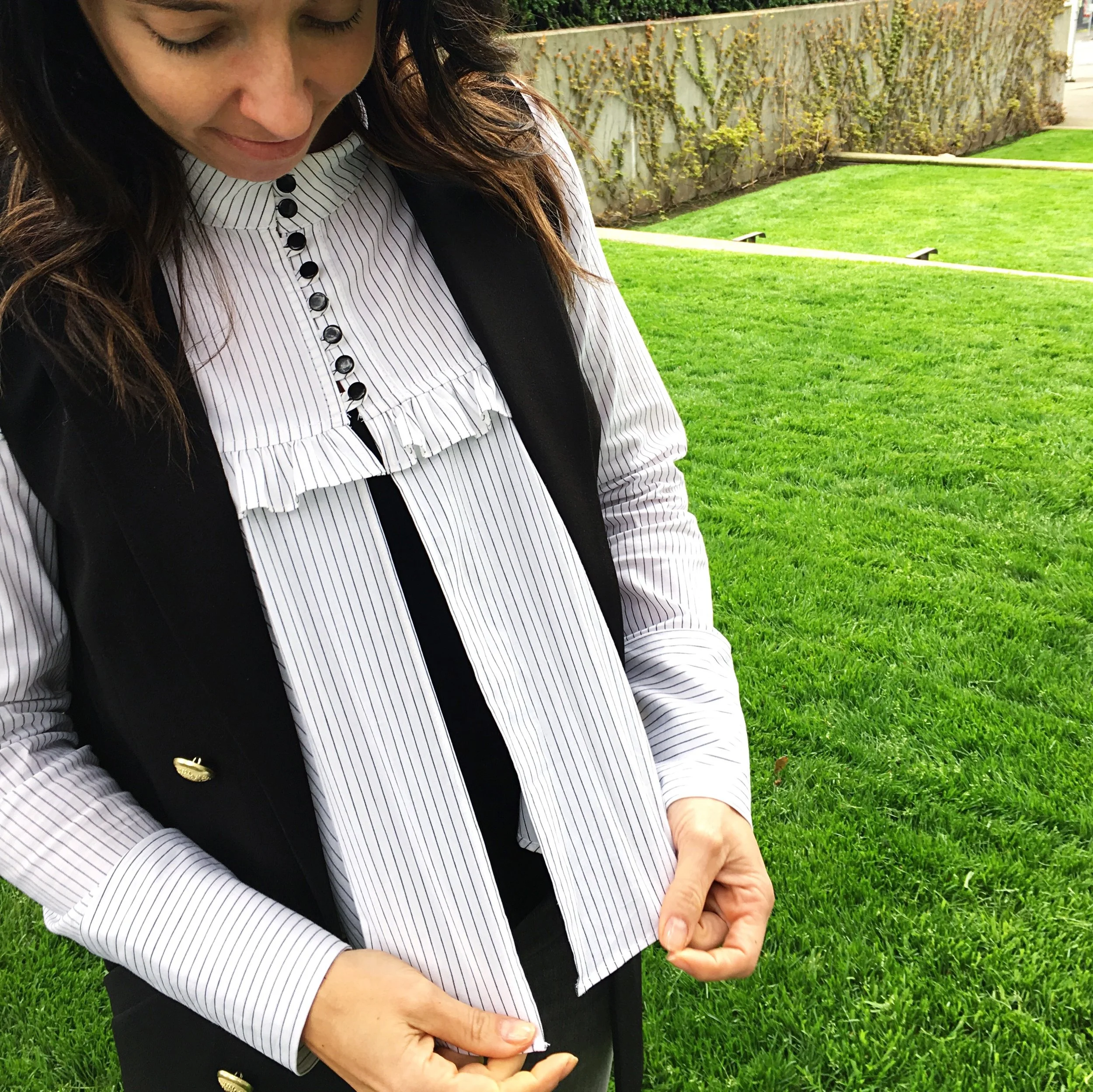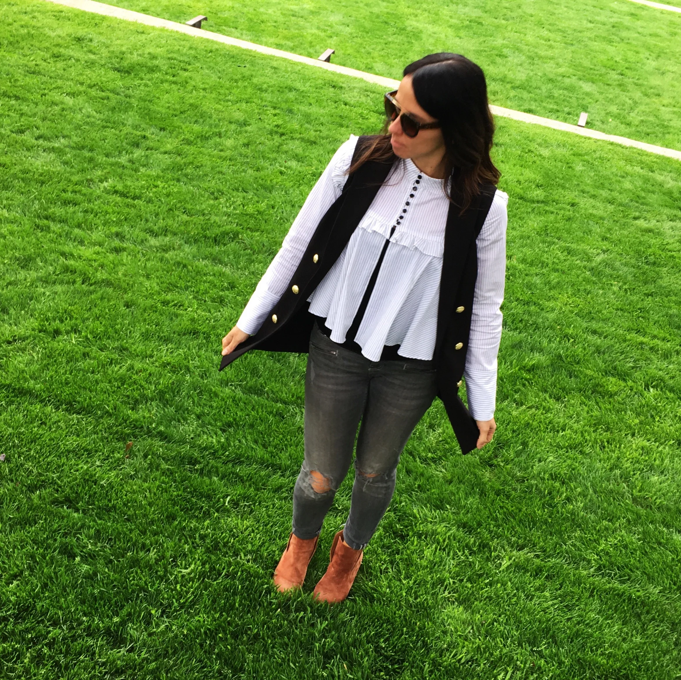 So about the outfit. This top I found at Nordstrom Rack one day and thought it would be fun to layer it. It's fun and playful. Great for work or even a night out with the girls. The sunglasses make me smile too. They are definitely different than what I would ever buy. Jeans from Zara and vest from Express. Check out the links below for similar items you may like.