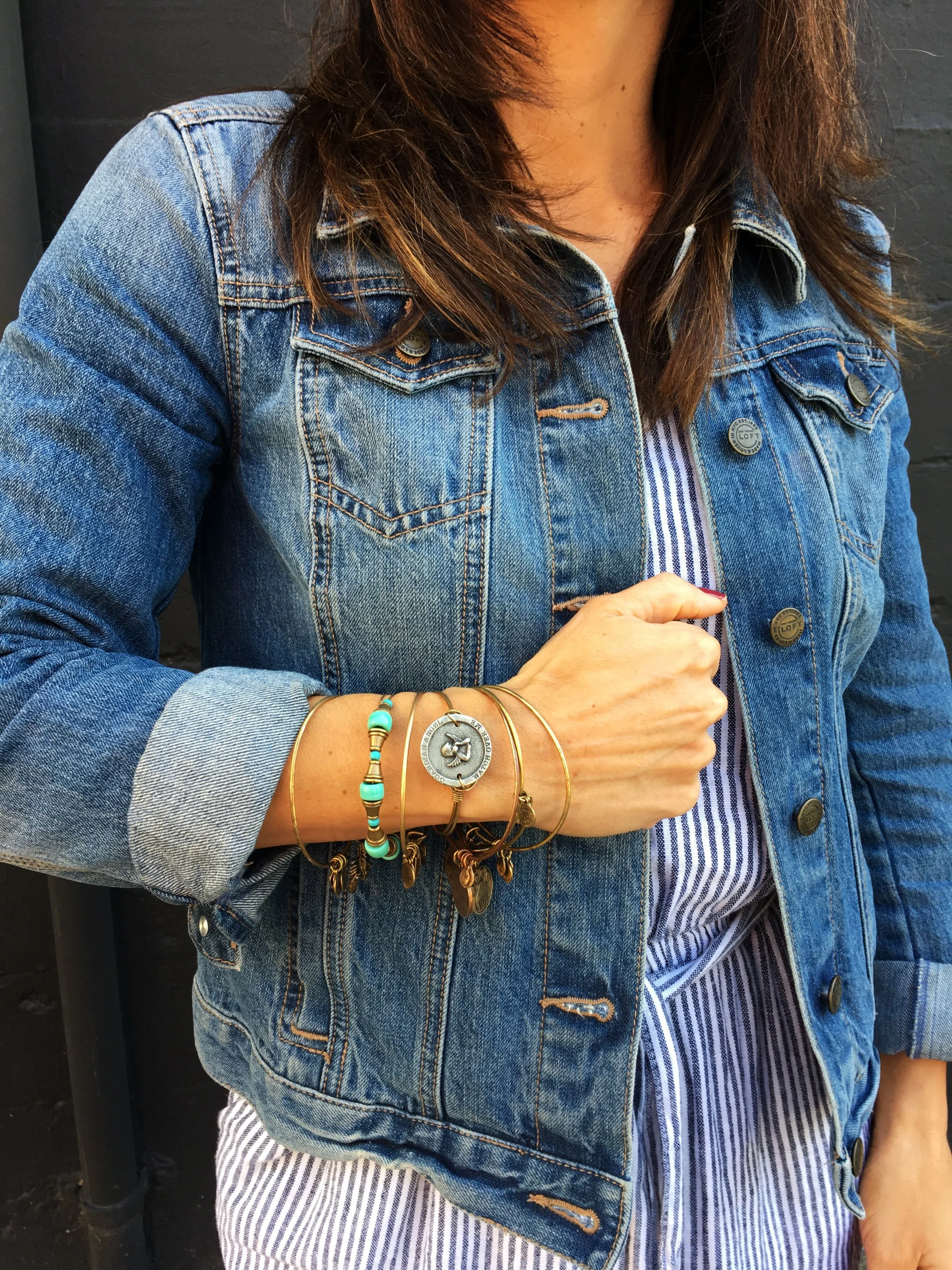 Call them jumpsuits. Call them rompers. Whatever you choose to call them, I'm a fan. Well at least until I have to use the restroom. My friend tagged me in a post that read, "rompers are cool n shit until you're in the bathroom peeing naked lmao". That quote couldn't be more accurate. What I LOVE about jumpsuits? Your outfit is done. Just like a dress you put it on and build around it. Super easy AND they are super comfy. I wore this jumpsuit from Old Navy with a jean jacket and booties. My bangles are a mix of Alex & Ani and Luca + Danni. Just remember two things when wearing a jumpsuit: have fun with it AND make sure you have someone to zip you back up when you're done in the bathroom.
